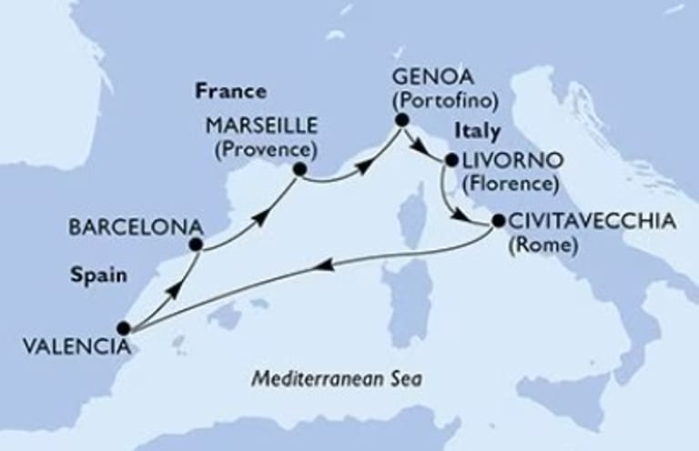 Marseille, Genoa, Livorno, Civitavecchia, Valencia, Barcelona, Marseille