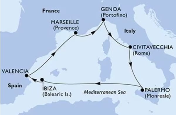 Marseille, Genoa, Civitavecchia, Palermo, Ibiza, Valencia, Marseille
