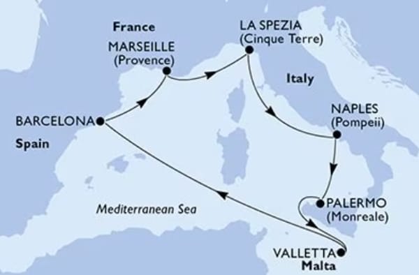 La Spezia (Cinque Terre), Italie • Naples (Pompeii), Italie • Palerme (Monreale),Italie • La Valette, Malte • Barcelone, Espagne