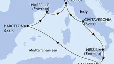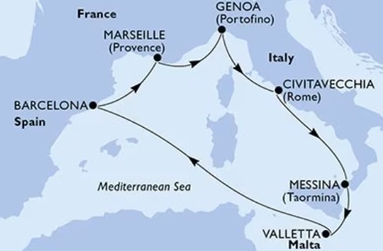 Marseille, Alicante, Valencia, Barcelona, Civitavecchia, Genoa, Marseille